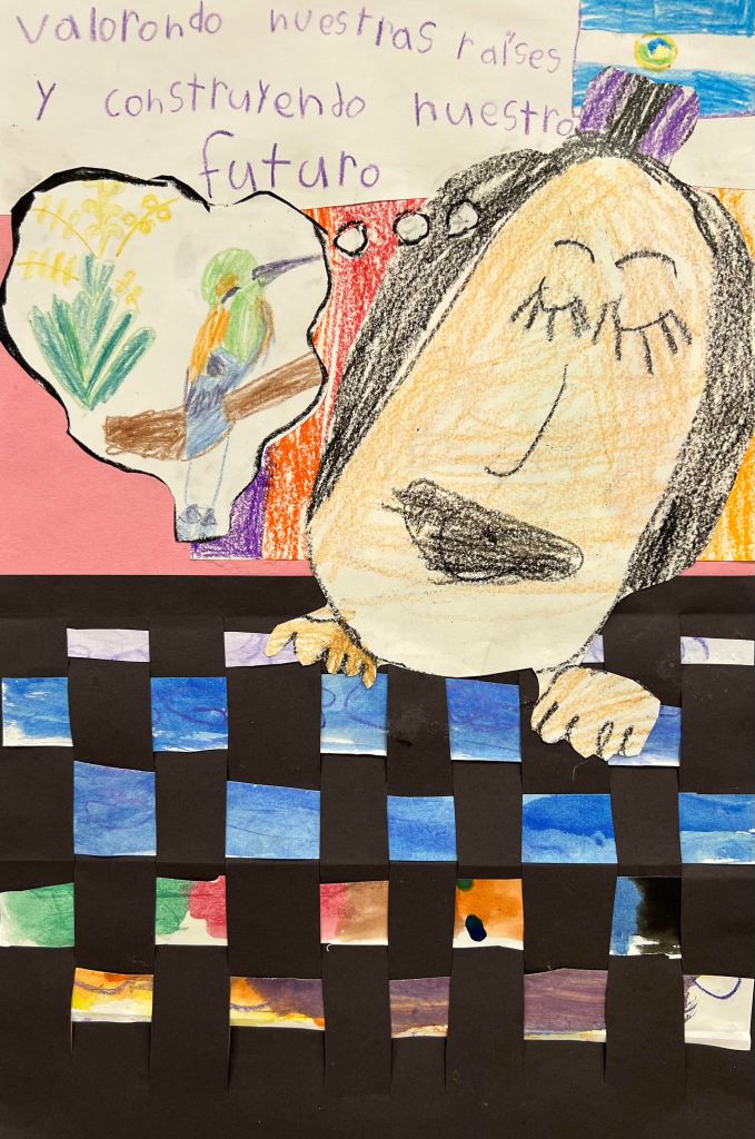 She painted paper with watercolor techniques, did a paper weaving for the blanket and drew her self-portrait, national bird, flower and flag. 12 x 18”/Mixed media (Crayon, watercolor, collage)